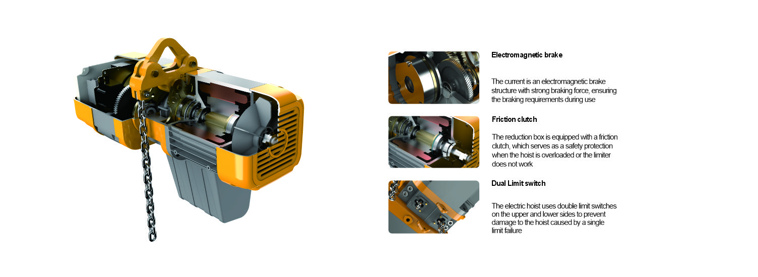 Maxloadc&h HHER series Electric Chain Hoist are designed with strength and stablility.The body is not only tough but also lightweight.The aluminum shell and exhaust fan effectively cool the hoist during frequent use.The strong braking force of electromagnetic brake can ensure the safe load.The sensor will cut of the power when overheating.